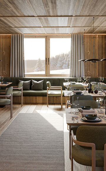 Nach außen fügt sich das Chalet Zuegg perfekt in die Landschaft ein. Die hübschen Holzhäuschen mit Sichtdachstuhl erinnern an Berghütten aus früheren Zeiten. Der geradlinige, cleane Stil mit viel Naturholz setzt sich im Inneren fort. Hochwertige Stoffe, große Glasfronten und stilvoll eingesetzte Designelemente verleihen den Chalets ein zugleich heimeliges und exklusives Feeling.