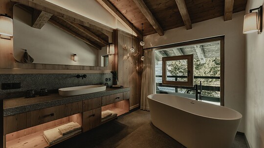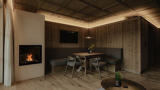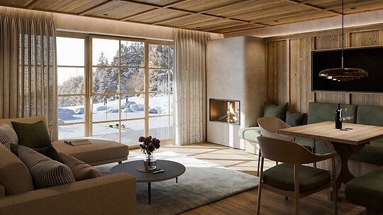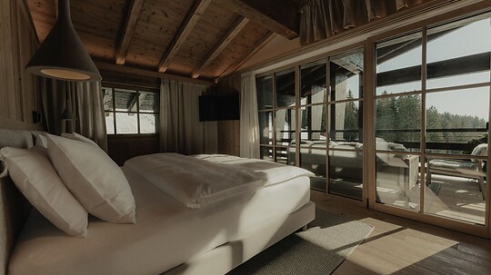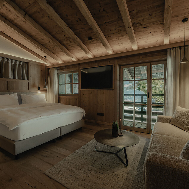 Das Zuegg Loft kombiniert alpinen Stil mit höchstem Komfort und bietet ein separates Kinderzimmer, eine voll ausgestattete Küche und eine private Terrasse.