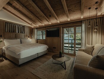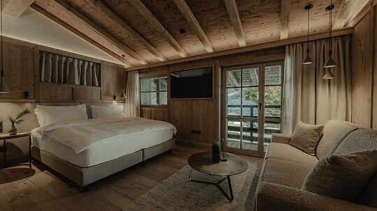 Questo loft elegante unisce lo stile alpino al comfort accogliente e offre un soggiorno e una camera da letto open space con balcone, divano confortevole, panca ad angolo...